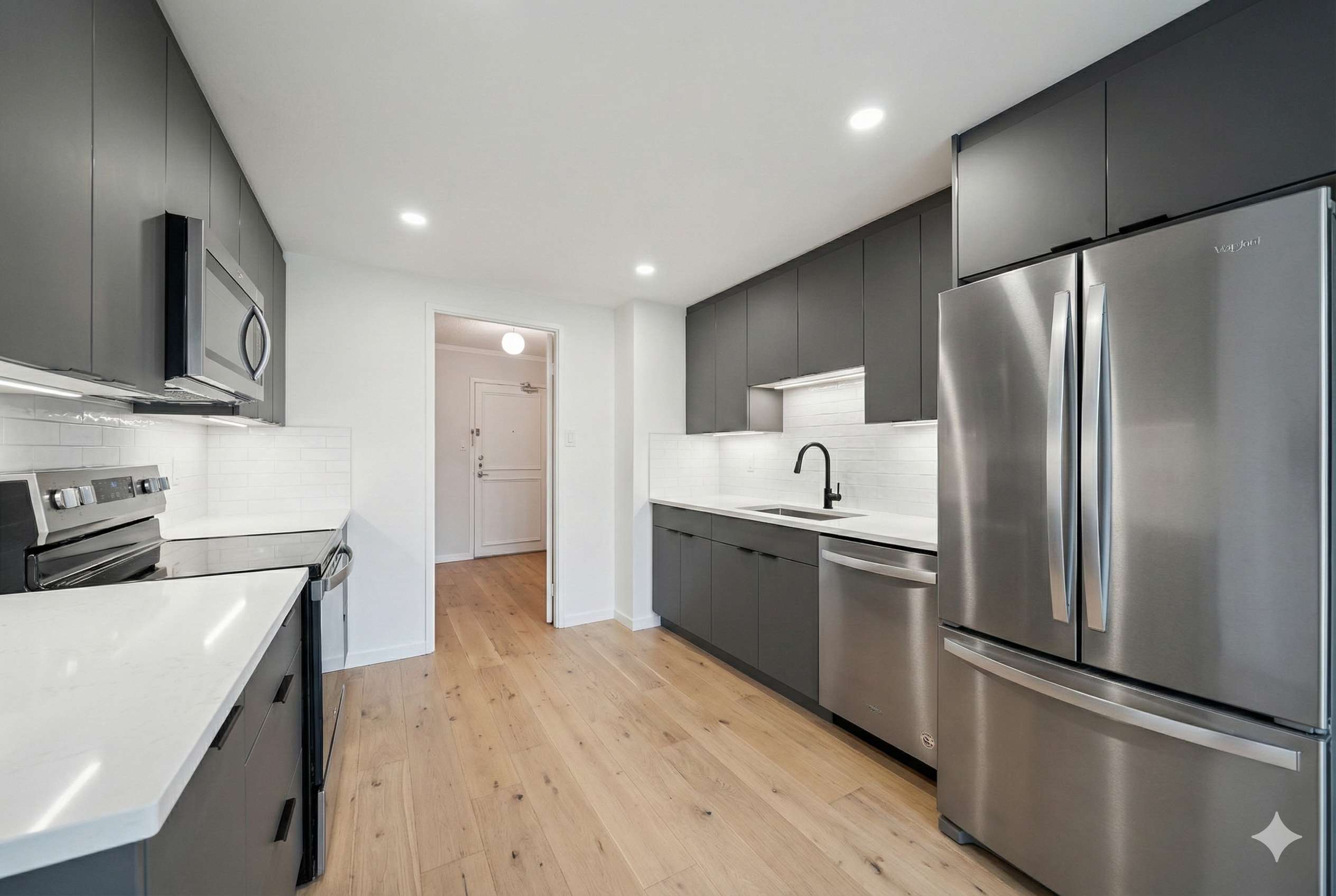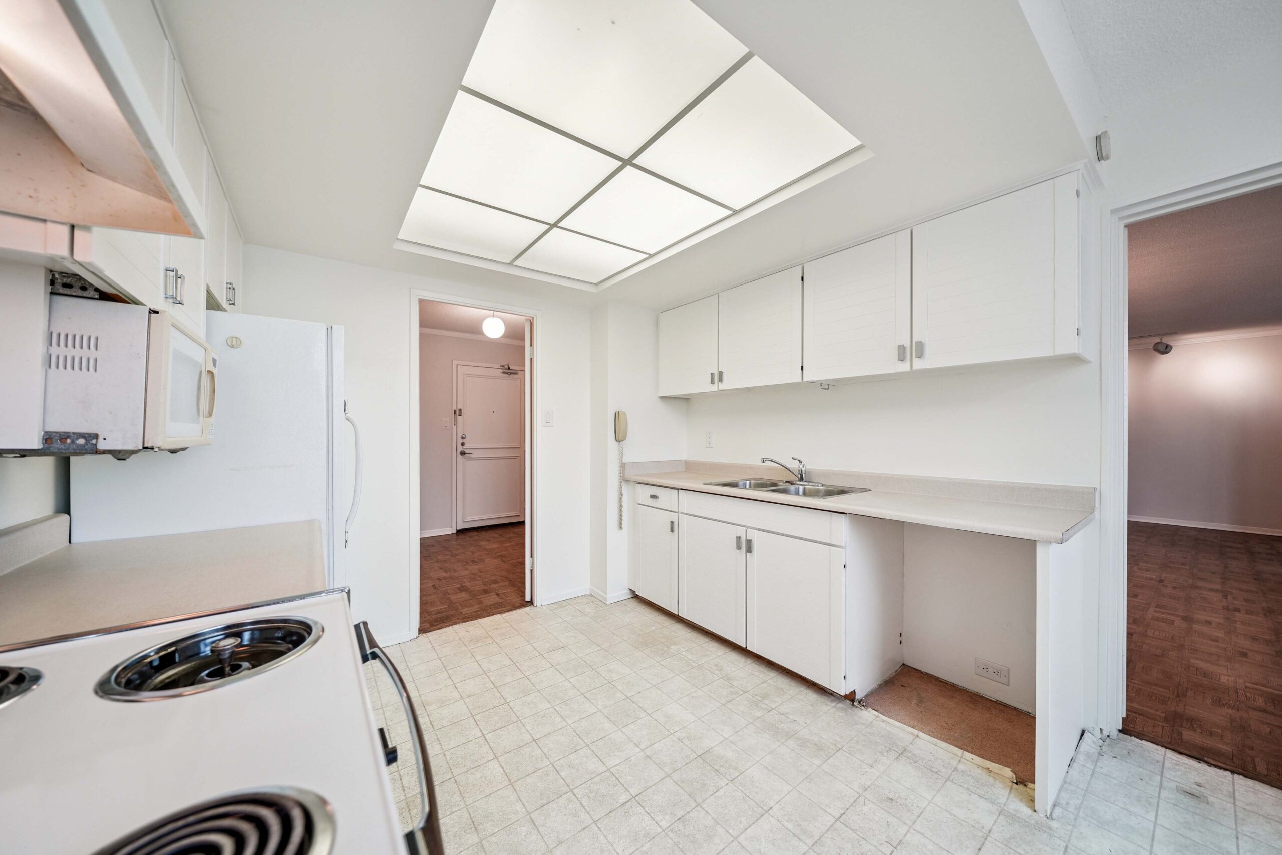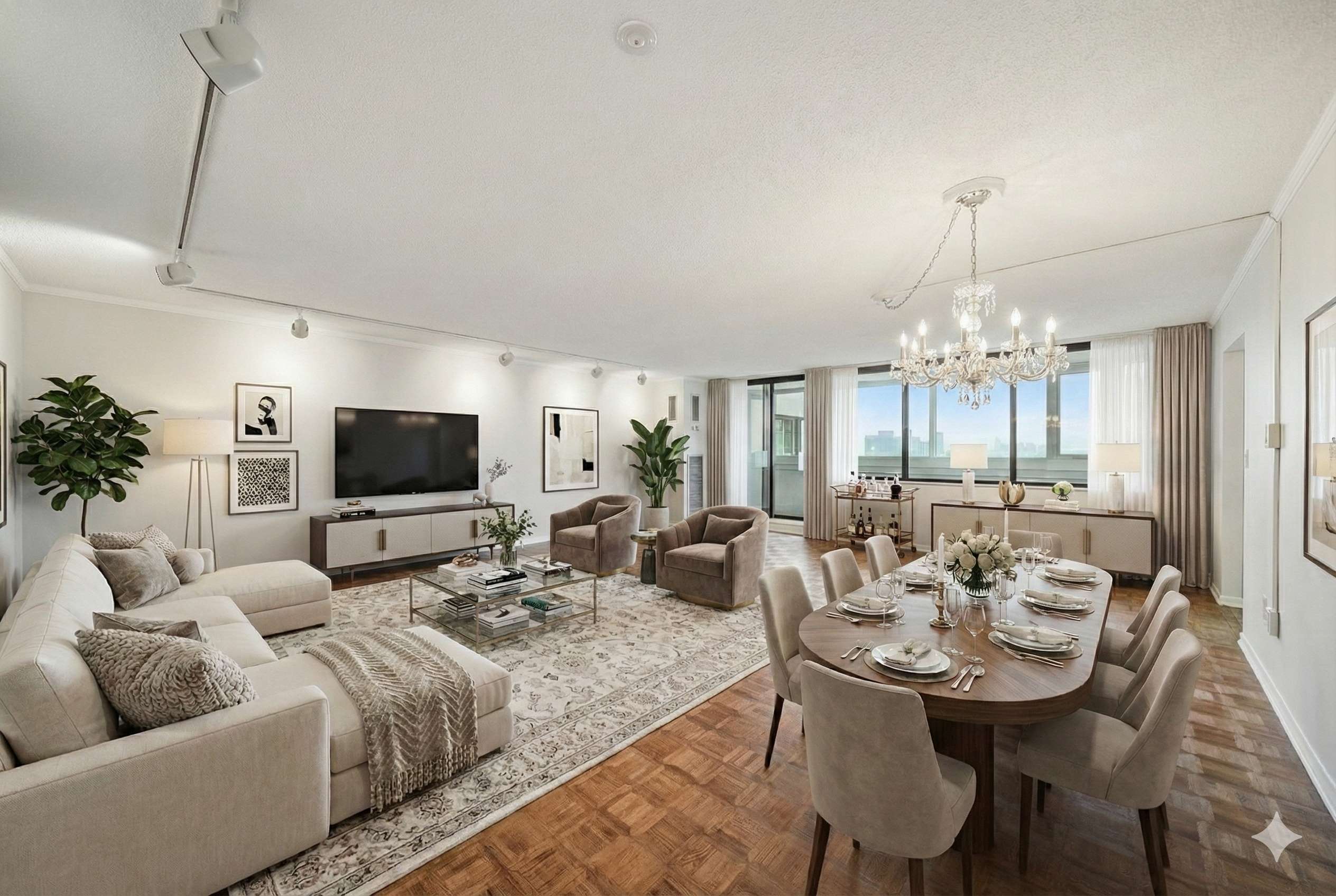 The thoughtfully planned layout provides generous principal rooms ideal for relaxed daily living and hosting family and friends. Expansive living and dining areas are complemented by a calm, neutral palette and refinished parquet flooring throughout the main living wing. A separate bedroom wing ensures privacy and quiet, featuring three oversized bedrooms with newly installed Berber broadloom and two full bathrooms. A welcoming foyer with a rare walk-in pantry offers excellent storage, while two side-by-side parking spaces, a conveniently located storage locker, and ample visitor parking add everyday ease.