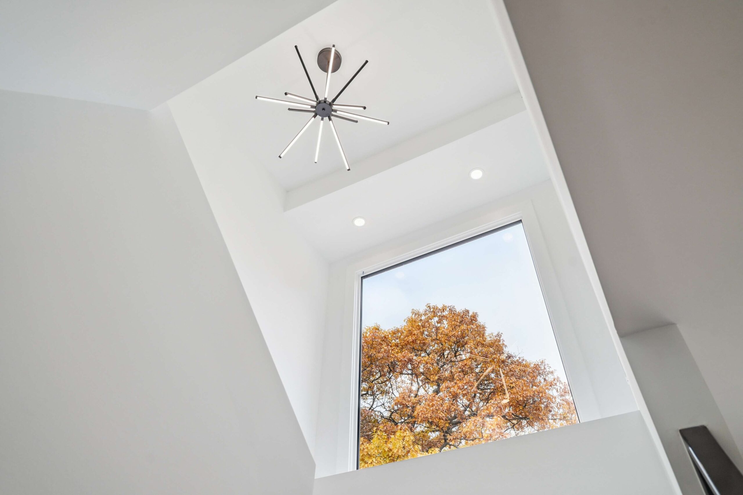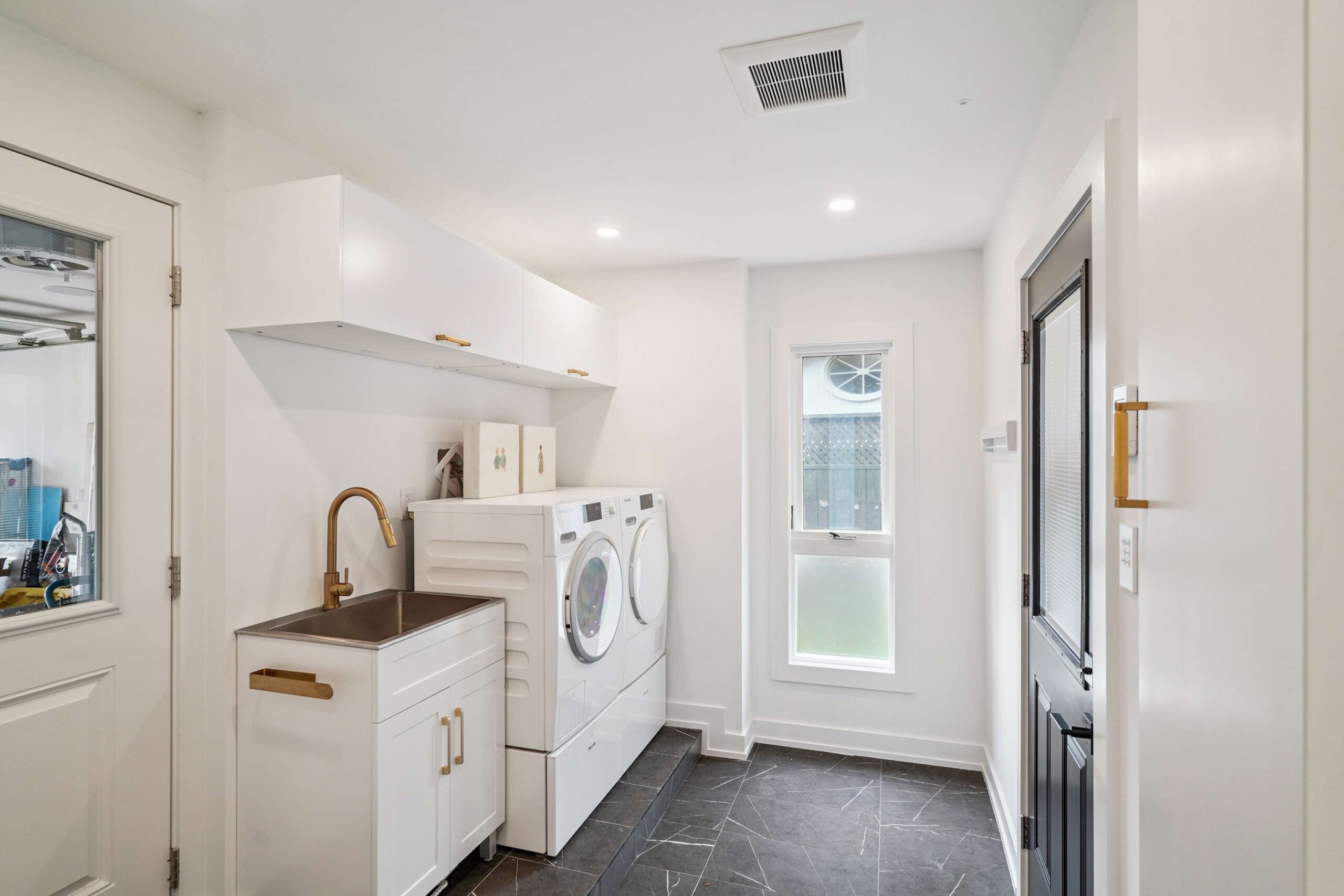 Bleached oak hardwood flooring flows seamlessly throughout the main level, creating an airy and inviting atmosphere. The modern chef’s kitchen impresses with premium appliances, sleek finishes, and generous counter space ideal for cooking and entertaining. Adjacent to the open-plan living room, the main floor laundry and mudroom provide exceptional convenience for today’s busy family.