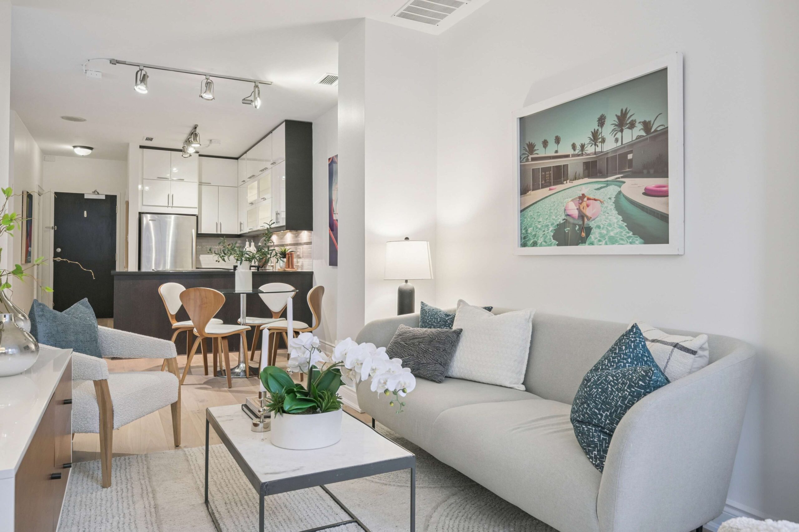Inside, the suite has been thoughtfully transformed with brand-new engineered flooring, a hotel-chic-inspired bathroom, and an updated modern kitchen featuring sleek stacked cabinetry, a peninsula with a full-size range, and clean, contemporary finishes. The generous full-size den—complete with a door—offers true versatility as a home office, guest room, or private creative space.